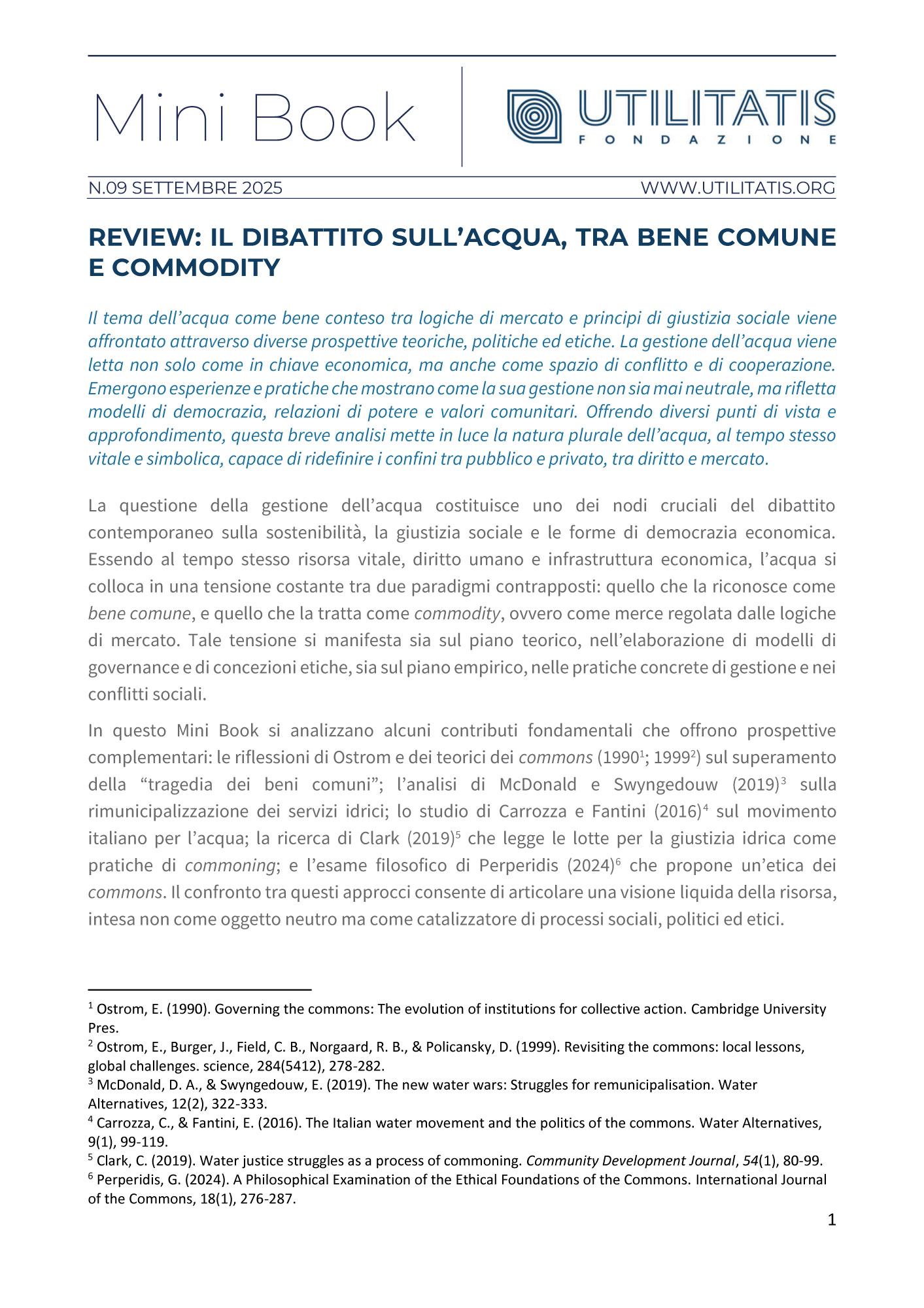 Il tema dell’acqua come bene conteso tra logiche di mercato e principi di giustizia sociale viene affrontato attraverso diverse prospettive teoriche, politiche ed etiche. La gestione dell’acqua viene letta non solo come in chiave economica, ma anche come spazio di conflitto e di cooperazione. Emergono esperienze e pratiche che mostrano come la sua gestione non sia mai neutrale, ma rifletta modelli di democrazia, relazioni di potere e valori comunitari. Offrendo diversi punti di vista e approfondimento, questa breve analisi mette in luce la natura plurale dell’acqua, al tempo stesso vitale e simbolica, capace di ridefinire i confini tra pubblico e privato, tra diritto e mercato.